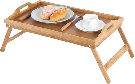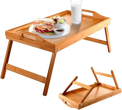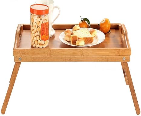 FURNINXS Bamboo Bed Tray Table for Eating Breakfast Tray for Bed Foldable Wood Serving Tray with Legs for Home Bedroom Hospital. Wood breakfast trays table with foldable legs easy to carry and foldsenough to save spaceis good for breakfast in bed or TV dinners. The bed tray is using widely as a breakfast trays to serving food like coffeeteabarsnacks platters eating on the bed activity table floor table.